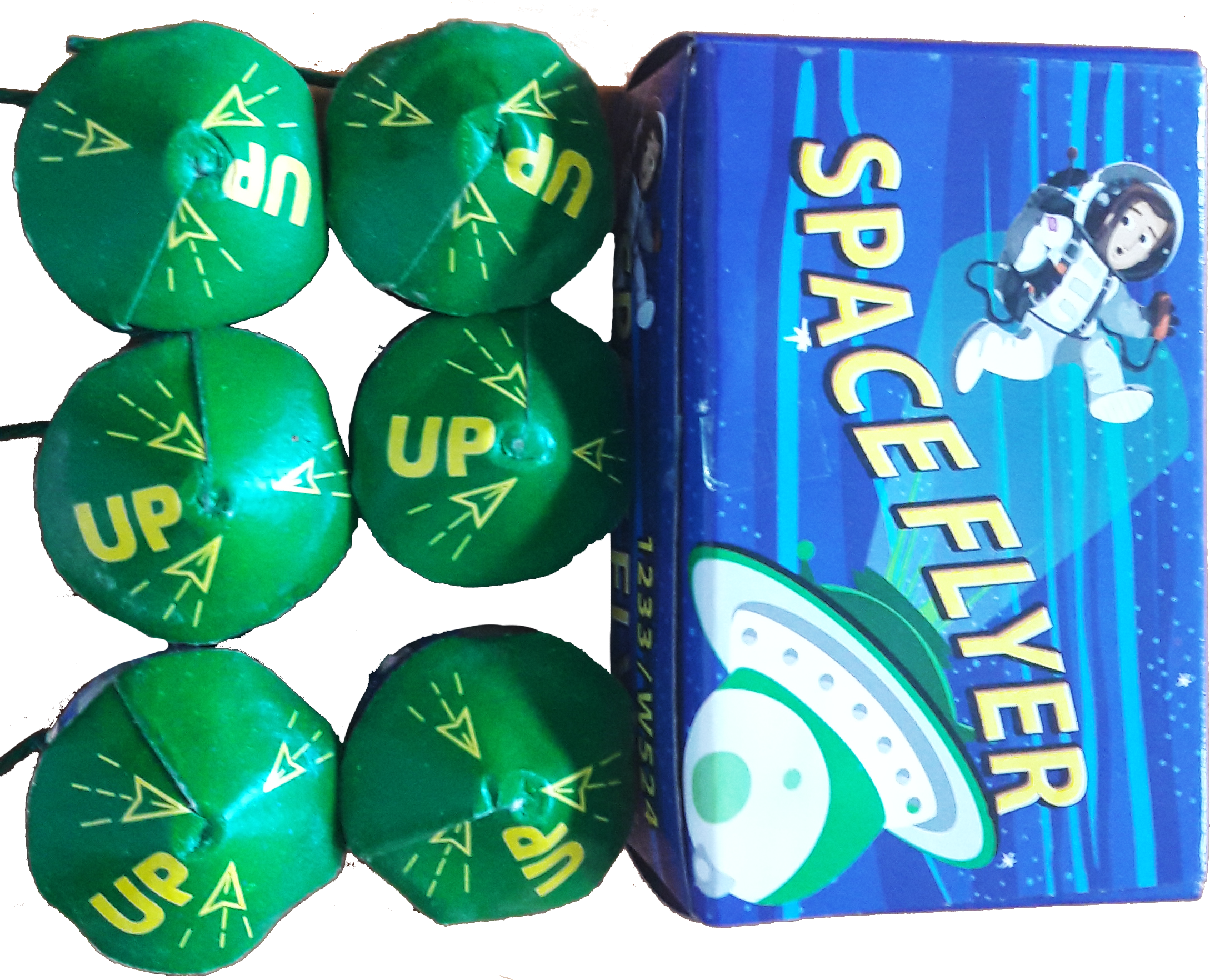 Space Flyer vagy elterjedtebb nevén, UFO. Színes, felszálló, fütyülő, forgó (6 db/doboz). A terméket mindig földön gyújtsuk meg, onnan kell indítani!